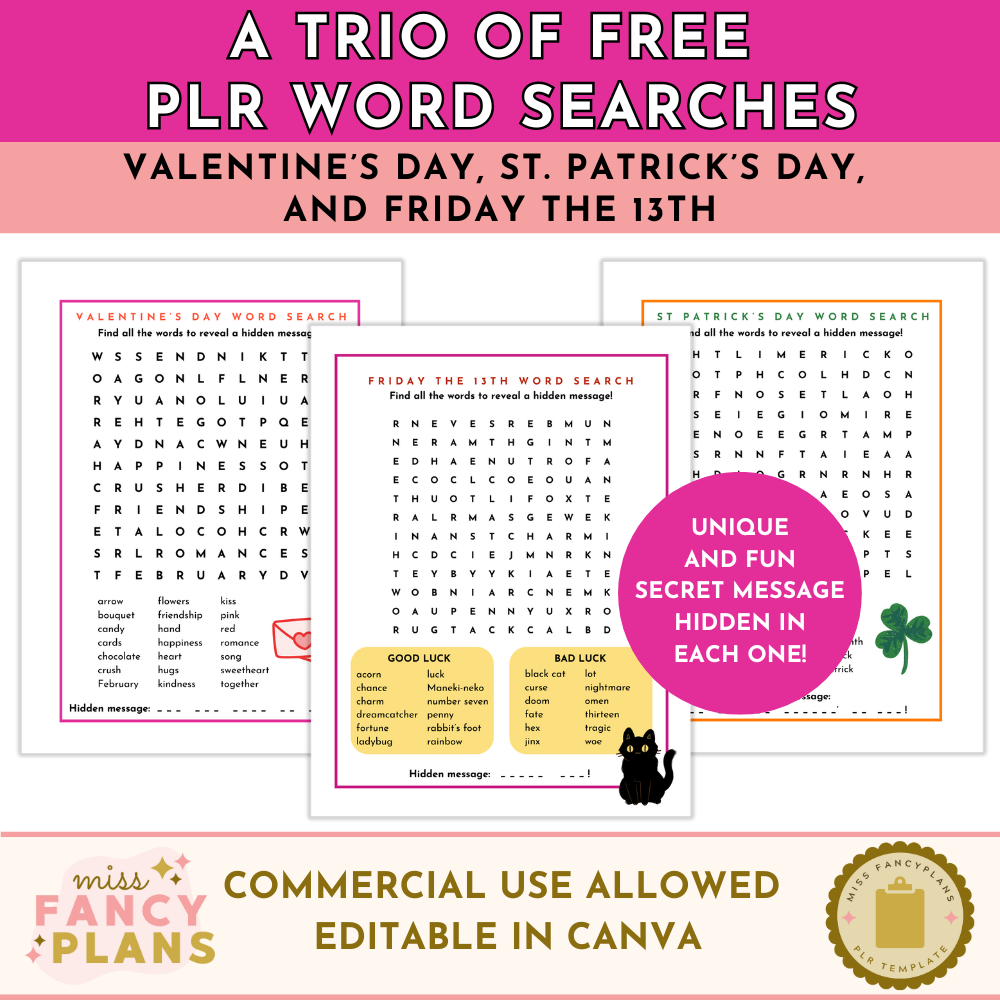 Try out this trio of PLR word searches! You’ll get three word searches – one for Valentine’s Day, one for St Patrick’s Day, and one for Friday the 13th. Each one comes with a secret hidden message made from the unused letters.